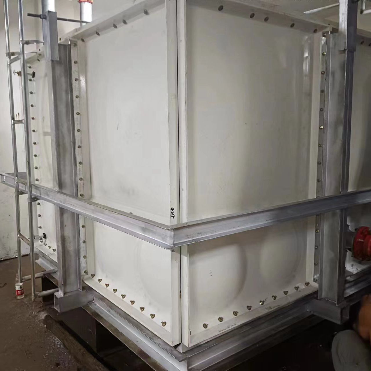 由于使用環(huán)境及使用介質所限,有些水箱內部盛有高濃度溶液,如:濃鹽水、海水等,對水箱內壁鋼板會有嚴重腐蝕,因此無法采用不銹鋼水箱或者鋼板水箱。正常玻璃鋼水箱板可以耐腐蝕,但是水箱內部又設有鋼制拉筋支撐等,故此也不適用以上介質使用。為了滿足特殊用戶的使用需求,經過承重及承壓測試后,這種無內件玻璃鋼水箱面世,它采用不同規(guī)格(1000*1000mm、1000*500mm、500*500mm)的玻璃鋼模壓板組裝,水箱內部不設有任何鋼制配件,水箱外部及底部采用工字鋼加固,所有法蘭采用ABS材質俗稱塑料材質,外觀整潔無變形,內部無配件,易清洗、維護方便,延長了水箱的使用壽命,滿足特殊用戶的特殊需求。