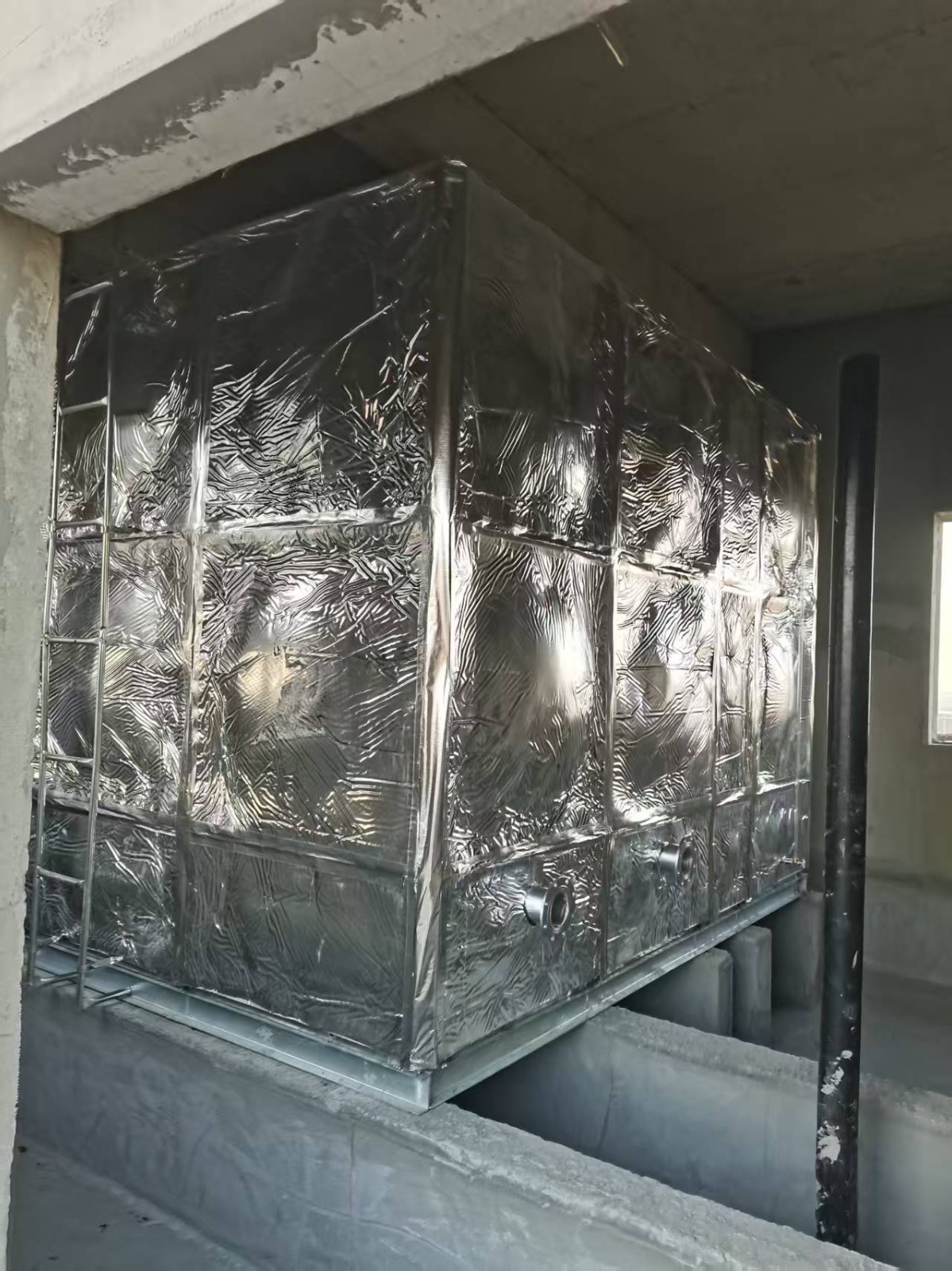 此水箱外表做了橡塑鋁箔布保溫層,鋁箔橡塑保溫材料為閉泡式結(jié)構(gòu),且表面平整光滑,所以外界空氣中的水汽很難滲透到材料之中,保冷保溫不必再添加隔汽層,從而獲得較佳的導(dǎo)熱系數(shù),它的陰濕因子大于4.5×103,使它的整體既是保溫層又是防潮層。因此適用于多種防火要求較高的場(chǎng)所使用。